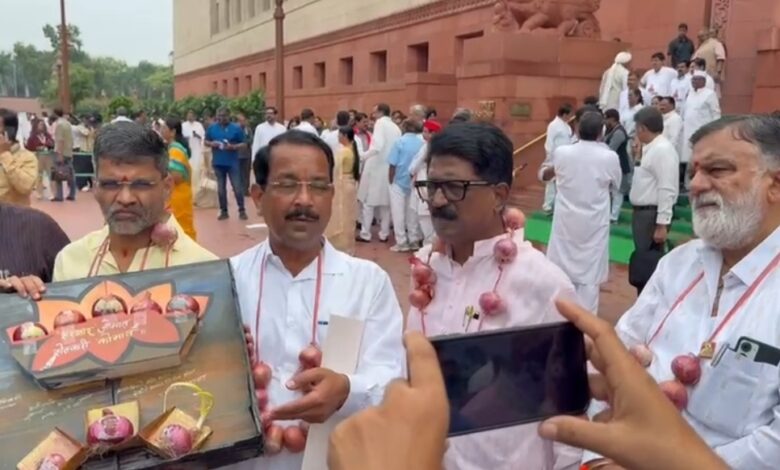 महाविकास आघाडीच्या खासदारांनी कांद्याच्या माळा गळ्यात घालून कांद्याच्या प्रश्नावर आंदोलन केले.