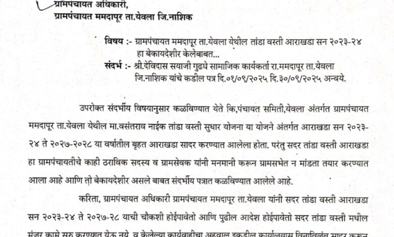 हा बेकायदेशीर केलेबाबत देविदास सयाजी गुडघे सामाजिक कार्यकर्ता रा. ममदापूर ता. येवला जि. नाशिक यांनी दि. ०१/०९/२०२५ दि. ३०/०९/२०२५ रोजी पंचायत समिती, येवला अंतर्गत ग्रामपंचायत ममदापूर ता. येवला येथील मा.वसंतराव नाईक तांडा वस्ती सुधार योजना या योजने अंतर्गत आराखडा सन २०२३- २४ ते २०२७- २०२८ या वर्षातील बृहत आराखडा सादर करण्यात आलेला होता. परंतु सदर तांडा वस्ती आराखडा हा ग्रामपंचायतीचे काही ठराविक सदस्य व ग्रामसेवक यांनी मनमानी करून ग्रामसभेत न मांडता तयार करण्यात आला आहे आणि तो बेकायदेशीर असले बाबत संदर्भीय पत्रात कळविण्यात आलेले होते. ग्रामपंचायत अधिकारी ग्रामपंचायत ममदापूर ता. येवला यांनी सदर तांडा वस्ती आराखडा सन २०२३-२४ ते २०२७-२८ याची चौकशी होई पावेतो आणि पुढील आदेश होईपावेतो सदर तांडा वस्ती मधील मंजूर कामे सुरु करण्यात येऊ नये व केलेल्या कार्यवाहीचा अहवाल कार्यालयास विनाविलंब सादर करून अर्जदार यांना आपले स्तरावरून परस्पर कळविण्यात यावे याबाबत पत्राद्वारे कळविण्यात आले.सामाजिक कार्यकर्ते देविदास सयाजी गुडघे यांनी