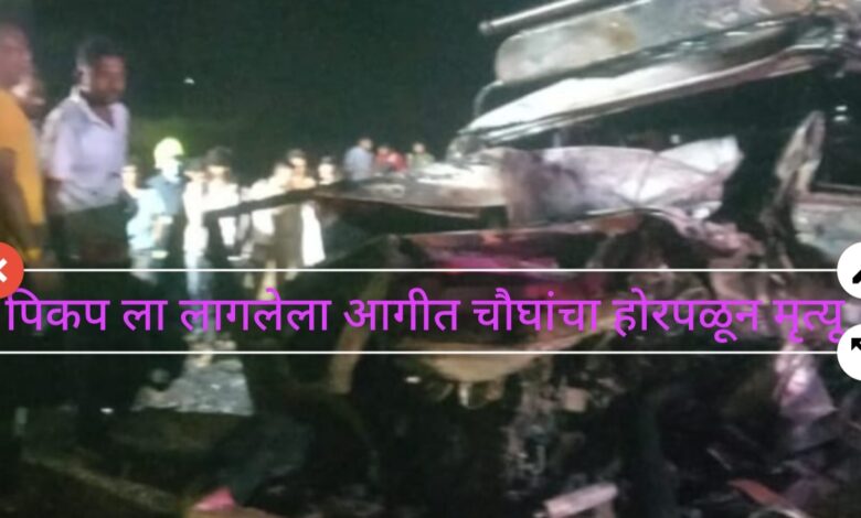 याबाबत प्राथमिक मिळालेल्या माहितीनुसार सविस्तर वृत्त असे की. सिन्नर तालुक्यातील पंचाळे ते शहा दरम्यान शनिवारी मध्यरात्री एक अत्यंत हृदयद्रावक घटना घडली. नातेवाईकाच्या ‘जागरण गोंधळ’ कार्यक्रमावरून घरी परतत असताना ट्रक आणि पिकअप यांच्यात झालेल्या भीषण धडकेत एकाच गावातील चौघांचा मृत्यू झाला. या अपघातानंतर पिकअप गाडीने पेट घेतल्याने तिघांचा गाडीतच होरपळून अंत झाला, तर एका महिलेचा बाहेर फेकले गेल्याने मृत्यू झाला.